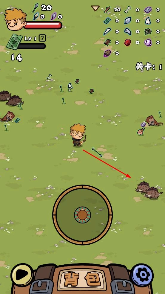 进入关卡(例如关卡1)后,在场景里和野猪这类生物展开战斗,通过操作对敌人发起攻击,与此同时收集四处散落的骨头、矿石、钱币等资源,逐步积累物资。