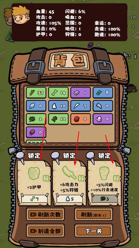 打开背包,用收集到的资源制作出能带来+2护甲、+6攻击力这类效果的道具,以此增强自身的血量、闪避、攻击等属性,之后就可以前往下一关继续展开冒险了。