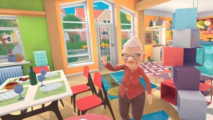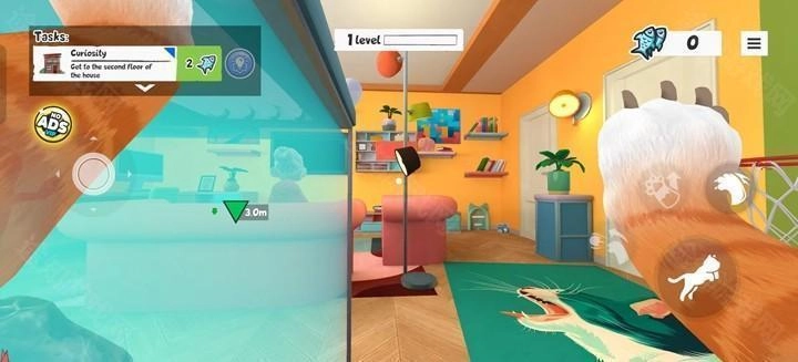 4、通过虚拟摇杆操控移动,滑动屏幕调整视角,破坏花瓶、偷吃食物、打翻物品,引发老太太追逐。