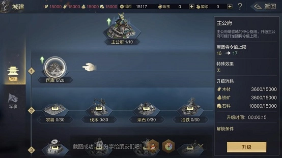 游戏前期提升主城等级到2-3级时,所需资源较少。可以先用初始的主公武将和华雄这类角色去攻打1级地块,把每个武将的带兵数量提升到大约1000人,之后再去攻占2级资源地,这样就能获取足够资源来升级主城的关键建筑。但由于1级地块的资源收益低,而且能占领的数量也有限制,等军团等级提升后,就需要合理舍弃这些低级地块了。