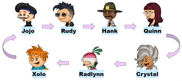 按照“最后一位顾客(closer)”的顺序表(见下图)来明确两人前来的日期,在到达该日期后,先暂停进入顾客信息界面,查看这位顾客的点单详情,接着一开始就把面包炸制完成,等接到第六位顾客的订单后立刻进行制作,制作完成后再接单并马上提交,通过这个流程就能完成成就。