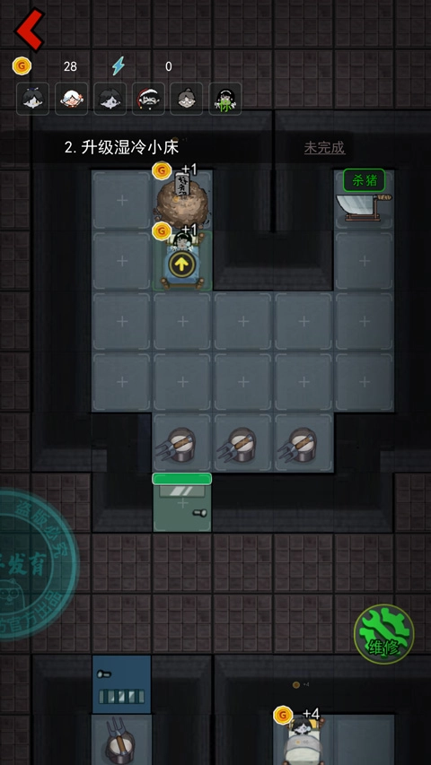 倒计时还剩5秒时先升级床,接着把大门升到2级。要是鬼先发起攻击,我们就先造武器,之后再升级门;当大门快要被打破时,记得点击修复按钮。