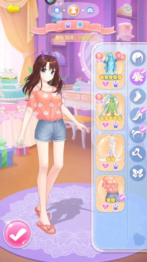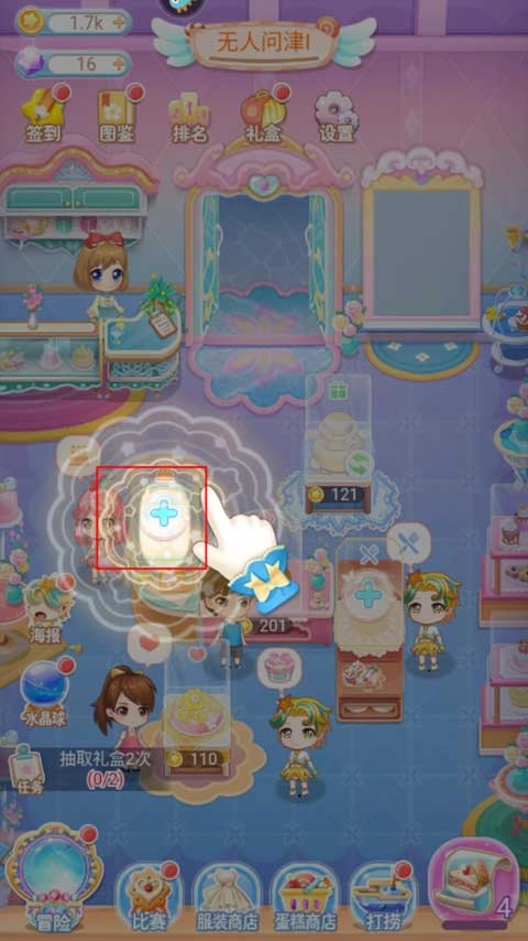 玩家需要点击小店门口旁那个类似镜子的图标。选好蛋糕类型后,就可以开始装扮自己的服装了。最后挑选一个你喜欢的杂志版式就行。