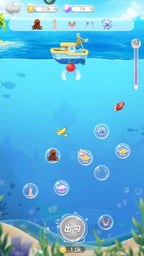 玩家可以点击下方的打捞选项,选好位置后点击出勾,就能得到新服装,偶尔还能获取金币之类的道具。