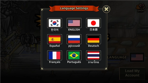 进入游戏首页后,玩家可通过右侧的language选项调节系统语言。