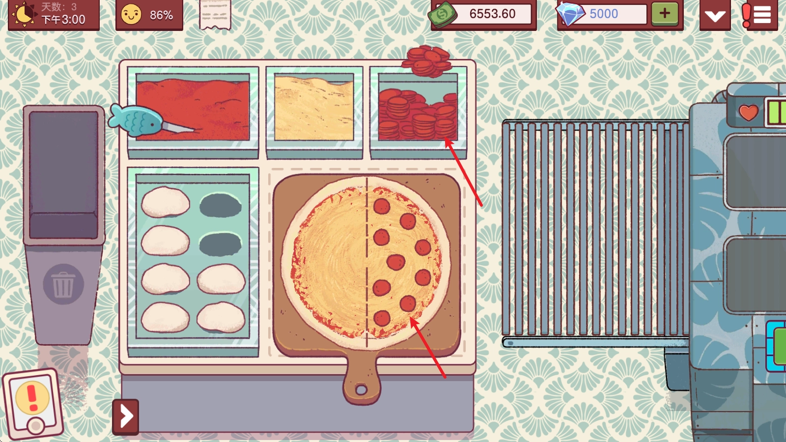 在游戏里,首先得仔细看清楚客人的需求,这样才能把披萨做好,制作的时候要是忘了,还能点左上角的纸条再看看。