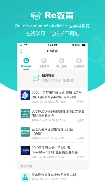【学术会议】针对线下学术会议提供在线报名管理、会议资料上传、信息统计等服务,使无法亲临现场的医生也能够参与其中。