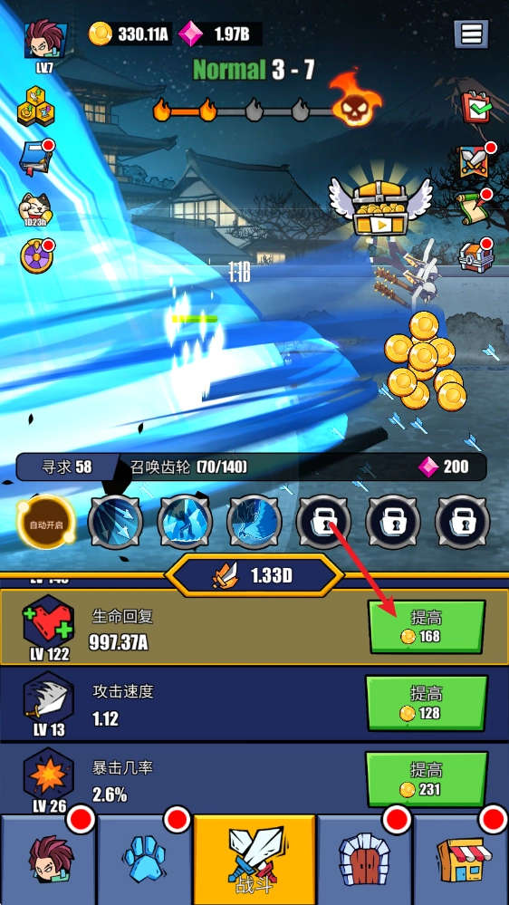 收集完金币,我们就能点击下方对应的属性来进行提升了。