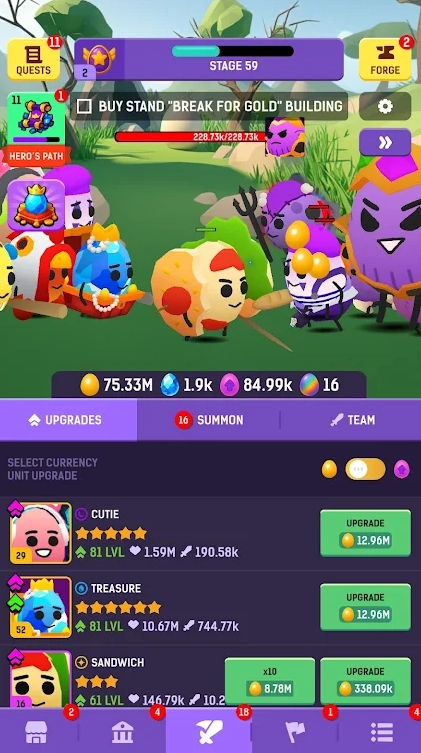 构建并拓展属于你的独特天地:在这款游戏里,你能体验的不只是刺激的战斗,还能亲手打造专属于自己的奇幻世界。用心经营你的基地,对各类建筑进行升级改造,同时积极收集丰富资源,以此来增强你的英雄实力和神器威力。你的基地,正是你在这个充满奇趣的蛋奇幻宇宙中强大力量的直观体现!
