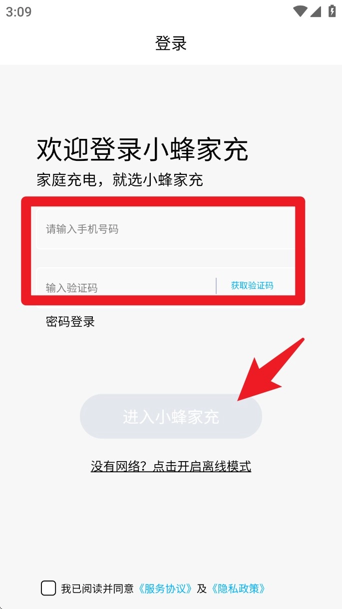 打开应用后进入登录界面,输入手机号码与验证码,点击下方的“进入小蜂家充”按钮即可完成登录流程。