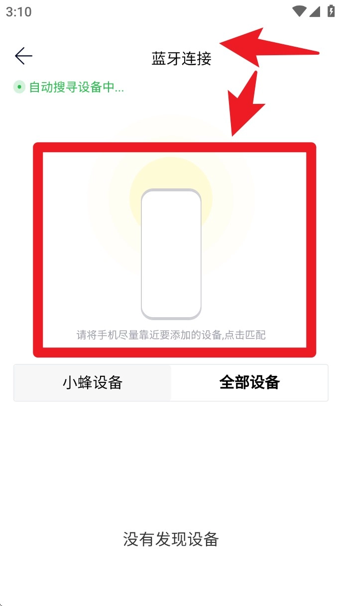 进入蓝牙连接界面后,请保持手机与设备的距离较近,系统会自动进行搜索,找到对应的设备后点击即可完成配对操作。