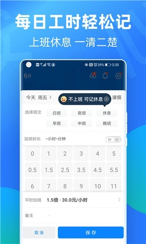 支持标准工时、小时工、综合工时等多种记录方式,工时制度可灵活切换,能满足各类蓝领不同的工时记录需求。初次使用时只需输入基本工资与考勤周期,系统便会自动计算不同时段的加班收入。安心记录加班情况,智能统计工时,自动核算工资,掌上考勤功能让你告别纸笔记录,实现全智能的加班记录统计。