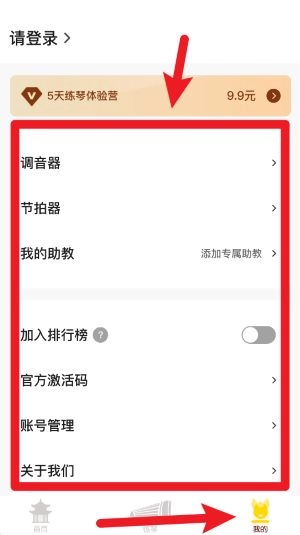 在我的页面里能够进入调音器、节拍器、账号管理之类的功能设置,还可以参与排行榜以及激活课程。