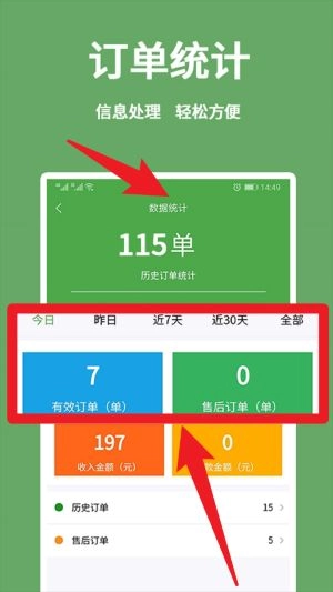在订单统计页面,商家能够查看今日、昨日、近7天、近30天以及全部时间段的订单数量、售后订单数量、收入金额等数据,从而快速掌握自身的经营状况。
