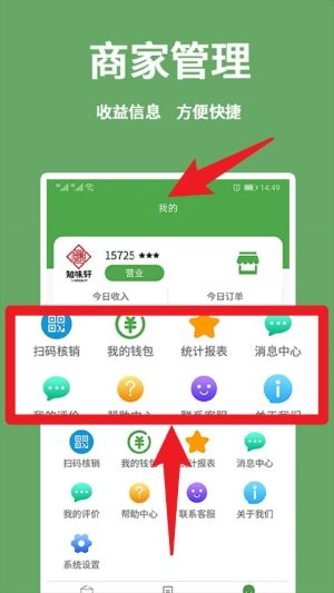 在商家管理页面,能够查看今日的收入情况和订单数量,还可以进入扫码核销、我的钱包、统计报表、消息中心等功能板块,从而对店铺的运营状况与收益信息进行全面管理。