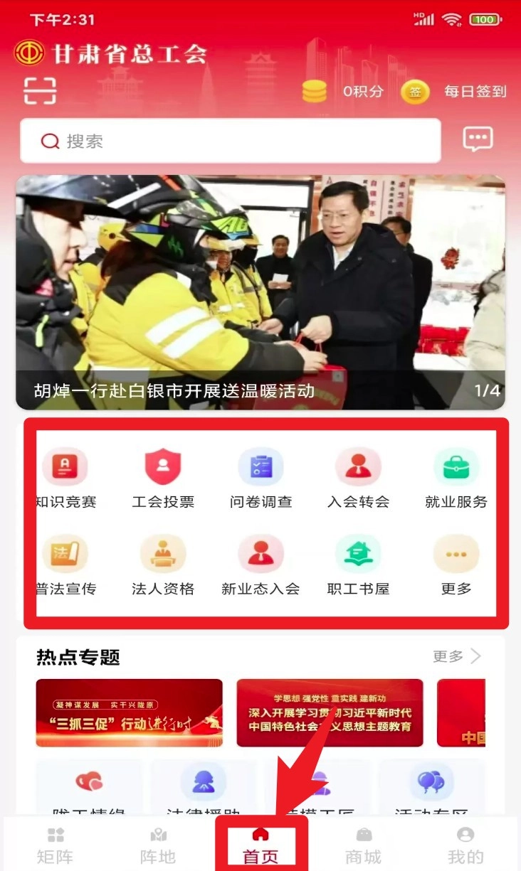 在底部导航栏点击“首页”,即可进入工会投票、入会转会、就业服务等常用功能的入口。