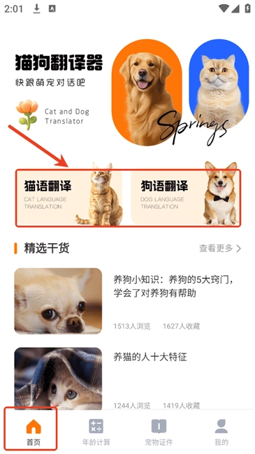 在【首页】点击“猫语翻译”或“狗语翻译”