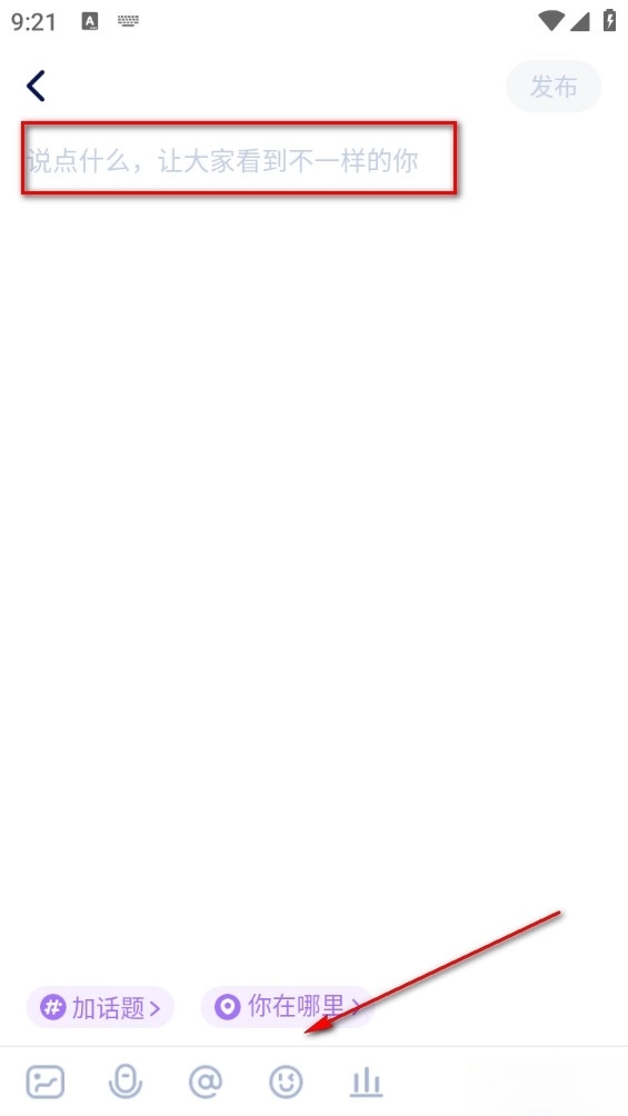 在这里可以输入想要发布的文字动态,还能点击下方插入图片、话题等其他元素。