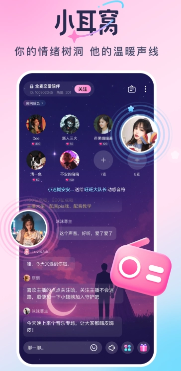 小耳窝是一款充满暖意的社交聊天应用。用户能借助丰富的语音资源结识朋友,在软件里探索自己感兴趣的语音室。社区里有各式各样的聊天主题可供参与,它就像给你一整天最温暖的拥抱。你可以选择聆听不同的声音,释放自己的情绪;也能创建群聊模式,邀请最合心意的人来拉近彼此的距离。小耳窝为每位用户提供治愈的声音体验,无论是疲惫的工作日,还是孤独的夜晚,这里都有温柔的男声为你讲故事、唱歌,带来心灵的慰藉。