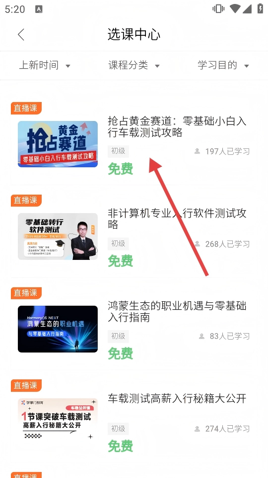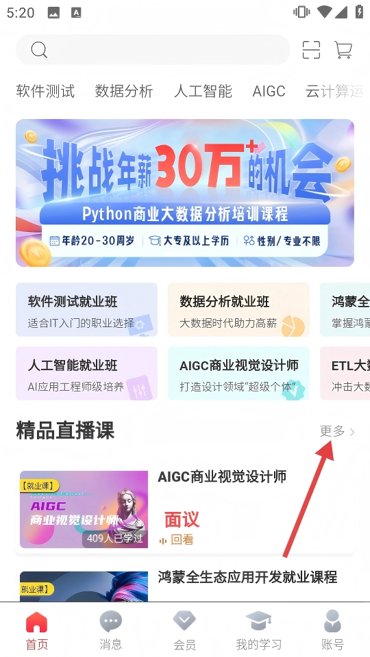 你可以先进入首页,找到【精品直播课】这个板块,然后点击它右侧的【更多】按钮,这样就能进入选课中心页面了。