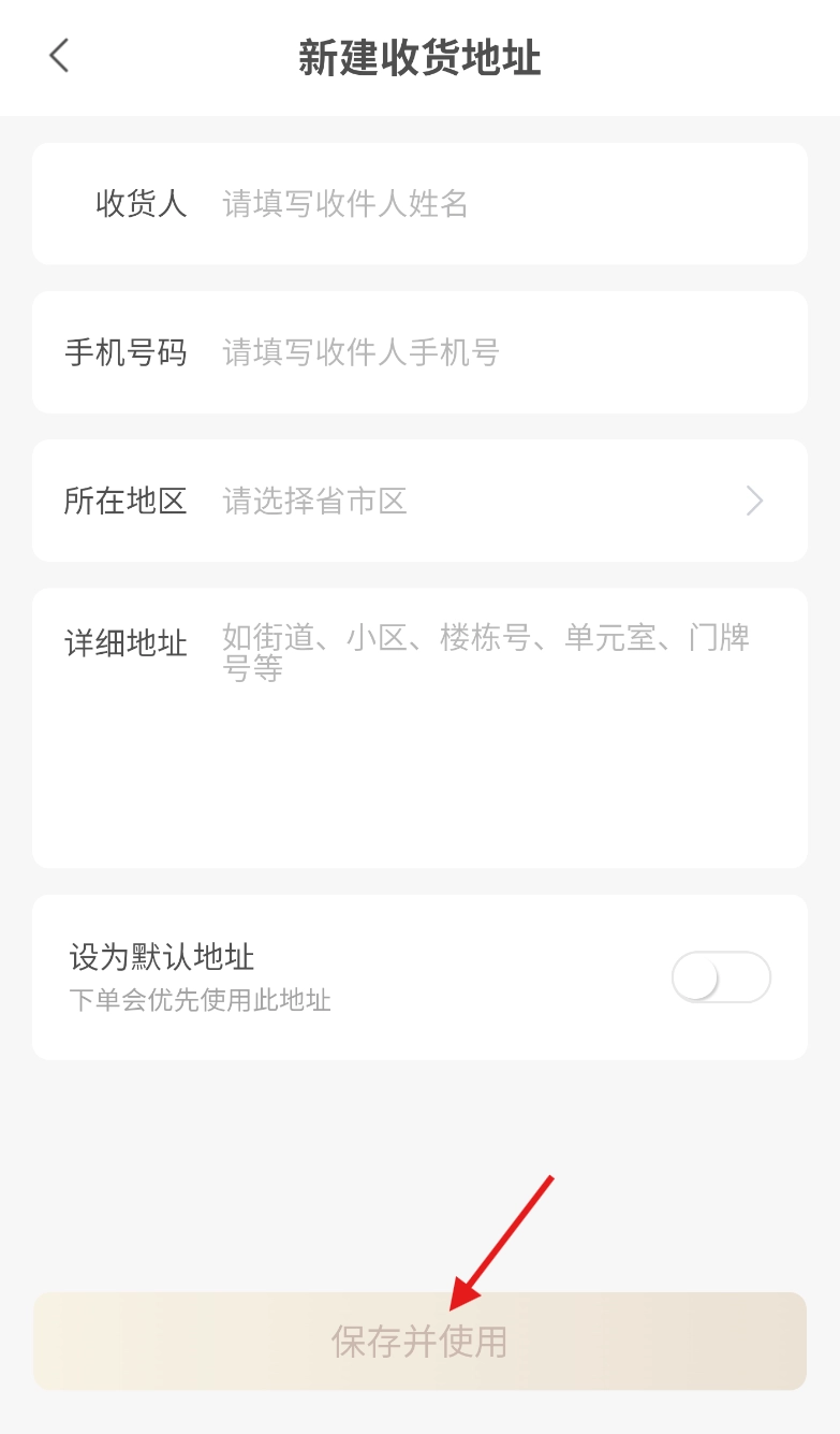 当弹出新建页面后,按顺序填写详细地址、联系人姓名、联系电话等相关信息,检查确认信息准确无误后,点击“保存并使用”按钮即可完成整个操作流程。