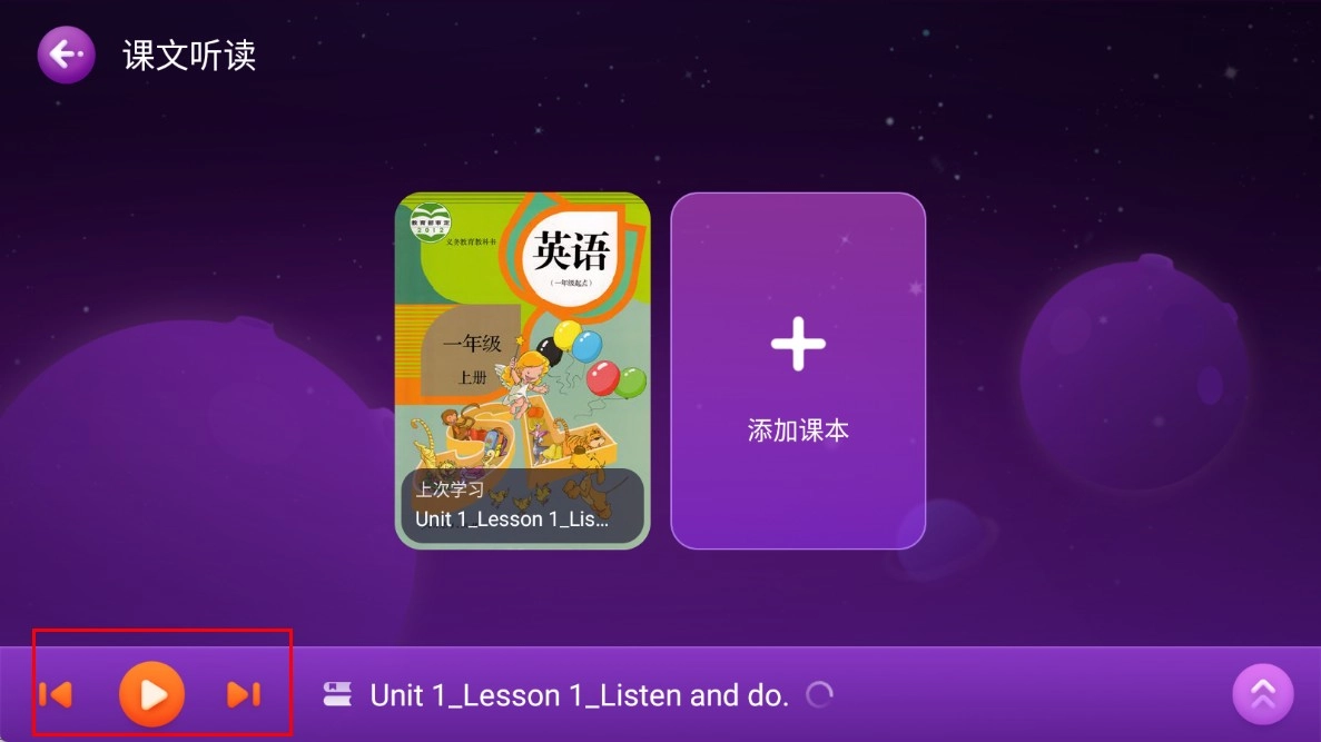 进入课文听读界面后,能够借助播放控制按钮开展课文听读活动。