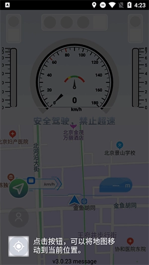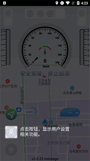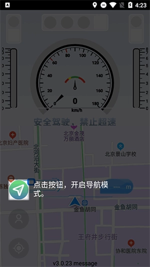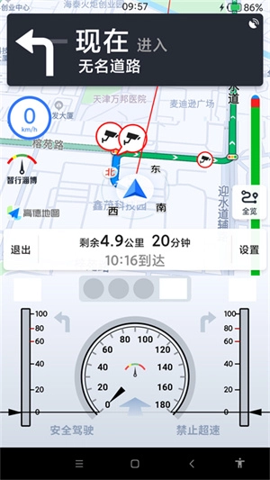 智行淄博的主界面展示如下,当驾驶车辆驶入道路并获取到前方路口信号灯的灯时信息后,对应的界面也呈现于此;该主界面主要由两部分构成,上半区域是车速诱导区,下半区域则为地图区。