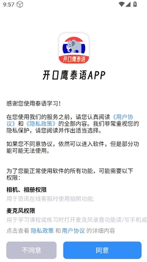 泰语学习的使用方法如下:1、在当前页面完成泰语学习软件的安装后打开它,首先需要同意隐私政策。