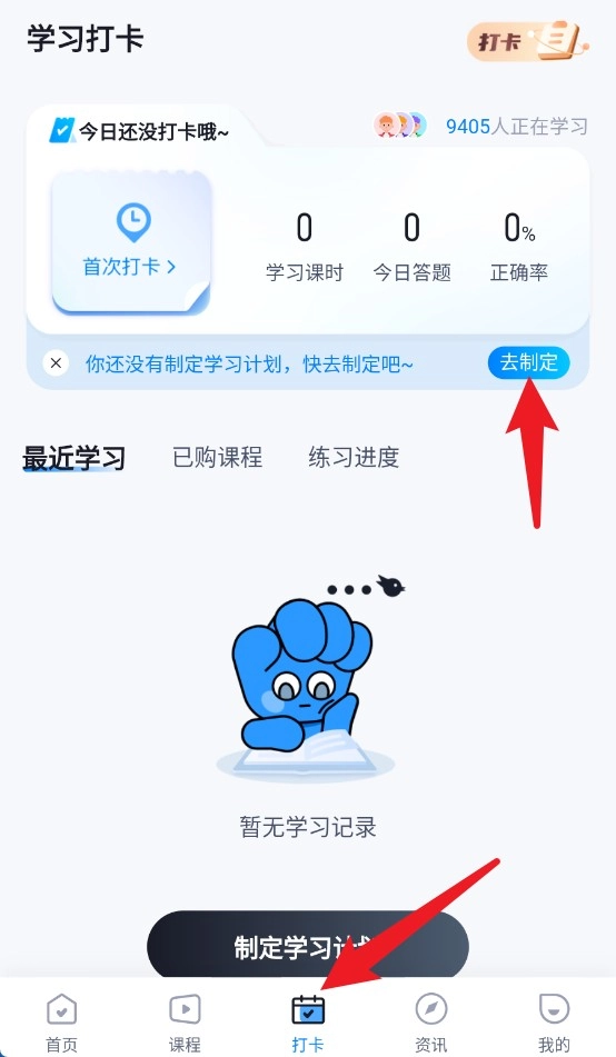 学习打卡板块能够查看每日的学习情况以及正确率,还支持制定学习计划,以此提升学习效率。