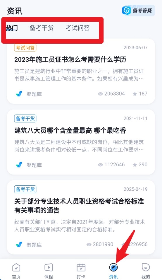 资讯板块涵盖热门、备考干货及考试问答三类内容,可助你及时获取考试的最新动态与实用经验分享。