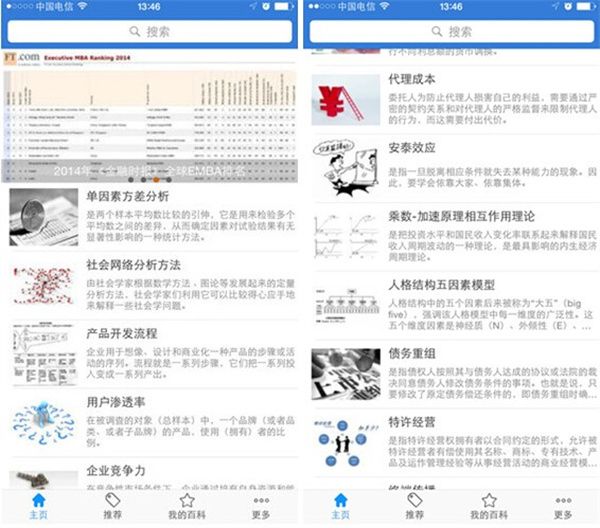 打开MBA智库百科,主页顶部设有循环滚动的头条焦点图,展示近期热门商业话题、排行榜、专业名词等内容,帮助用户快速掌握商业动态,扩充信息储备,不错过任何潜在商机。
