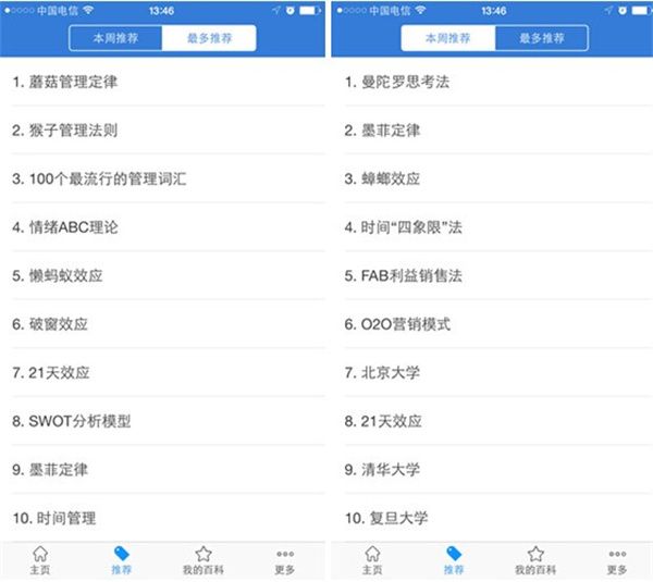 MBA智库百科除主页外,还设有推荐阅读页面。该页面分为本周推荐和最多推荐两个部分,会依据热门程度,分别为用户呈现10个本周或近期较为热门的名词,方便用户进行了解。