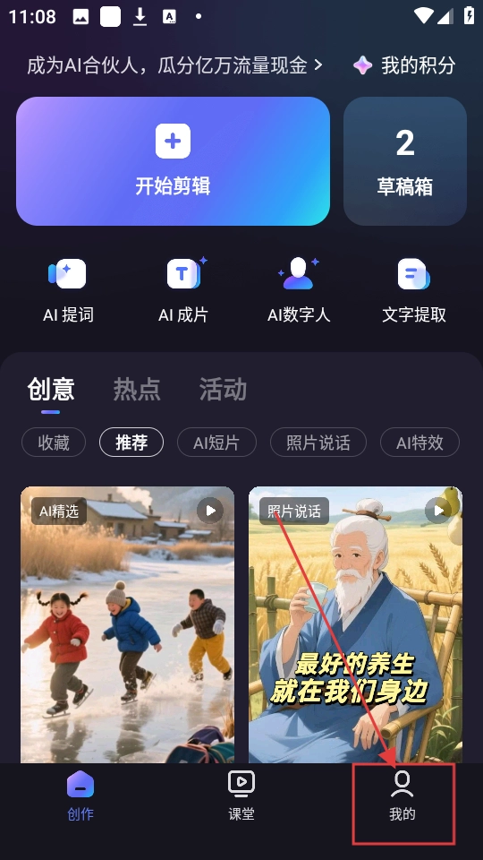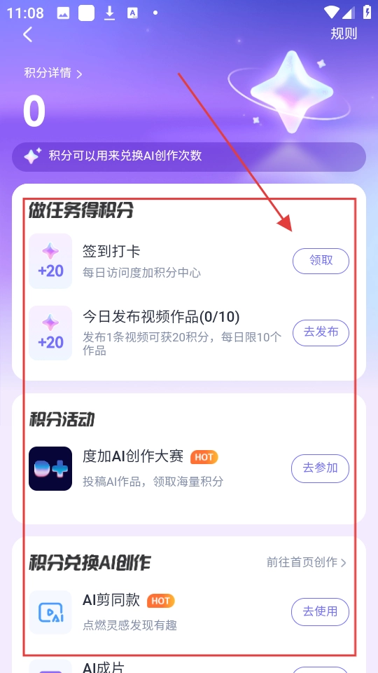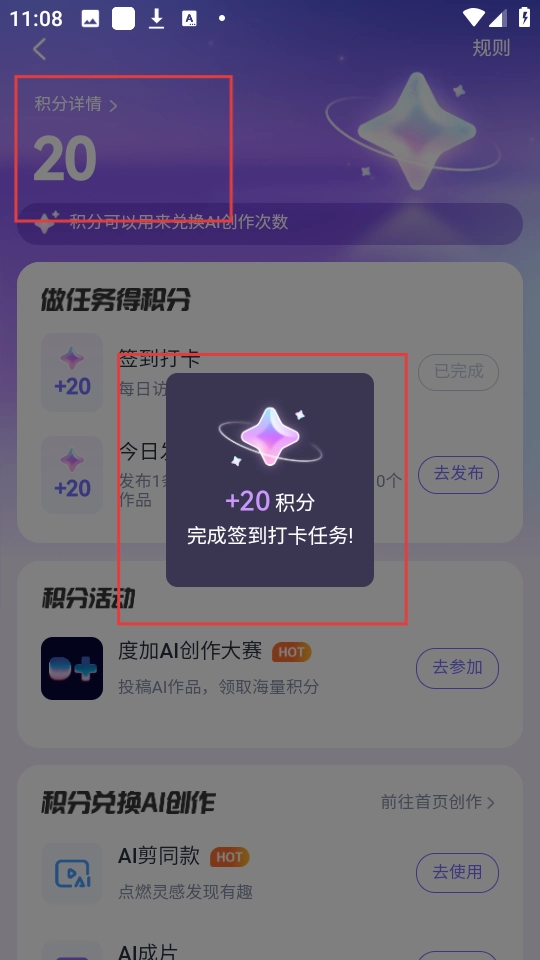 在积分详情页面完成签到打卡这类任务,就能获得积分,积分可以用来兑换创作次数呢。