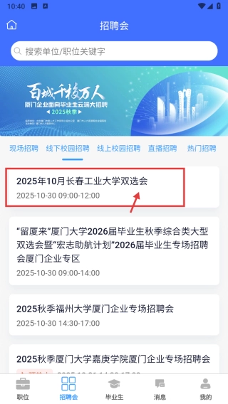 在列表页面找到“2025年10月长春工业大学双选会”这一条目并点击,即可进入该招聘会的详情页面。