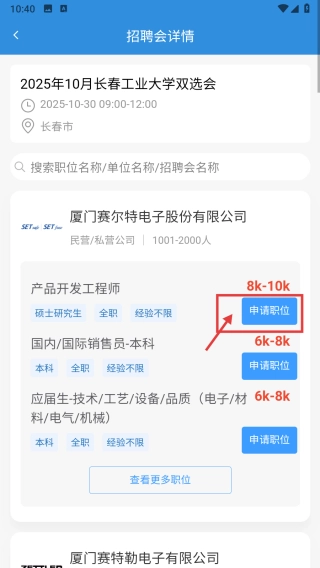 在招聘会详情页面,定位到产品开发工程师的职位信息,点击对应的申请职位按钮,即可完成该职位的申请流程。