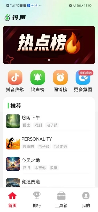 首页设有抖音热歌、铃声榜、闹钟榜板块,同时还为用户推荐了各类好听的铃声。
