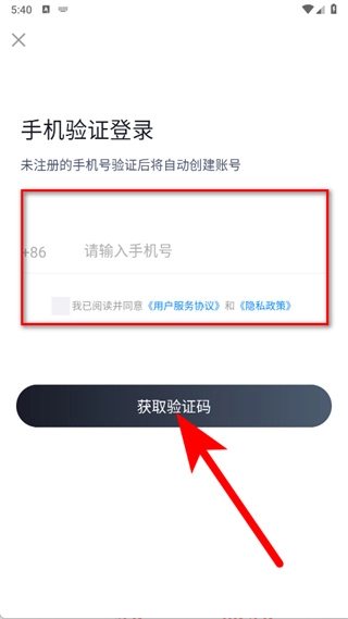在登录页面,输入手机号码,勾选相关选项后,点击获取验证码按钮。