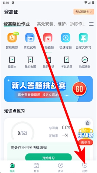 打开登高证考试聚题库,点击底部导航栏的“我的”选项,即可进入个人中心页面。