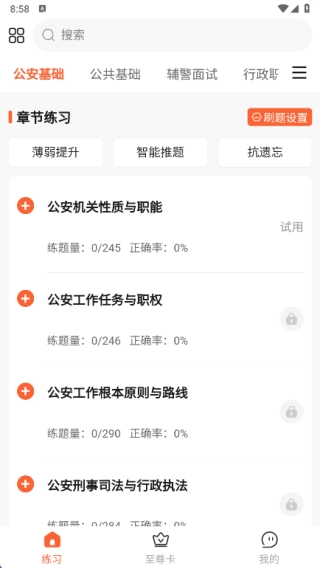 在章节练习环节能够开展刷题设置,核心涵盖薄弱点强化、智能题目推送、抗遗忘巩固这三大功能。