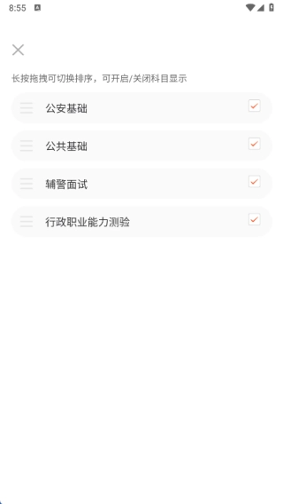 在界面右上角的三条横线菜单中,你可以选择公安基础、公共基础、辅警面试以及行政职业能力测验中的任意一个科目。