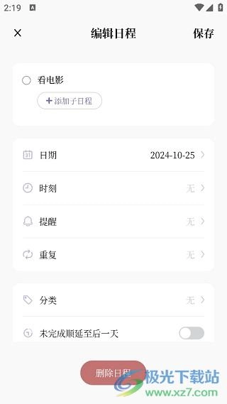 点击刚才新建的日程就能进入编辑页面,在这里可以对日期、时间、分类等进行调整,调整好后点击右上角的“保存”按钮。