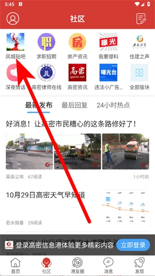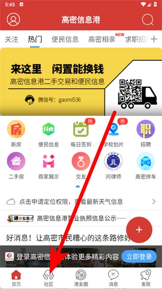 打开高密信息港后,点击底部导航栏中的“社区”选项,即可进入社区页面。