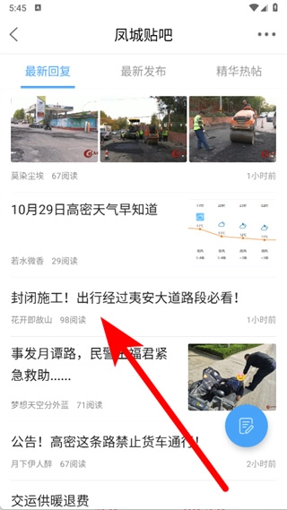 在社区页面,点击凤城贴吧,进入贴吧内容页。