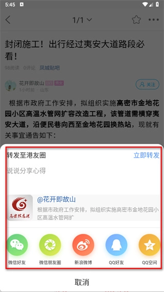 在帖子详情页面,点击右下角的分享图标后,会弹出分享选项。