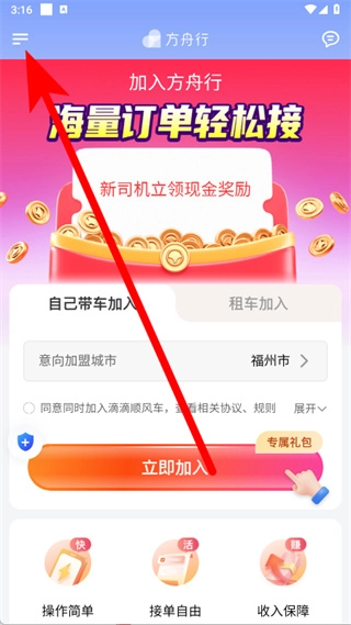 打开方舟行,点击左上角菜单按钮,展开侧边栏。