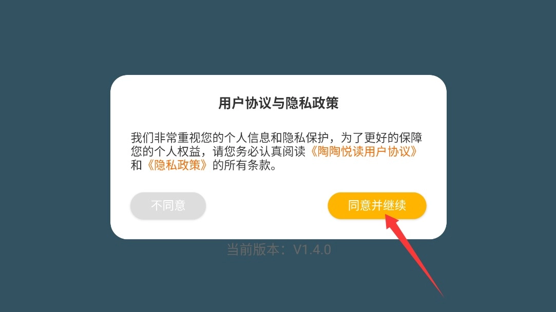 打开陶陶悦读,仔细阅读用户协议与隐私政策,确认无误后点击同意按钮,即可进入注册界面。