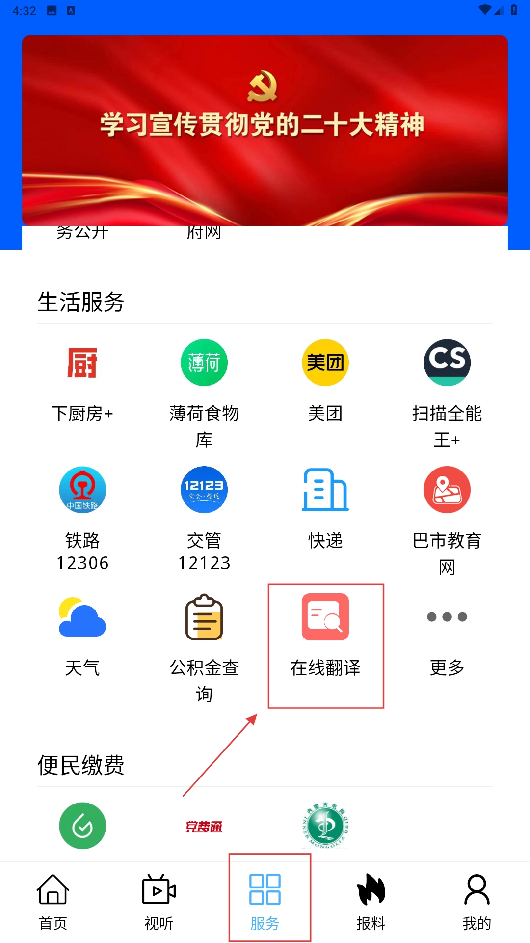 在服务页面能够点击【在线翻译-功能按钮】,从而进入翻译工具页面。
