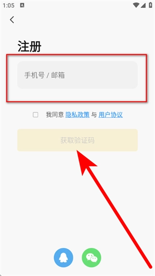 在注册页面,输入手机号或邮箱,勾选相关选项后,点击“获取验证码”按钮。
