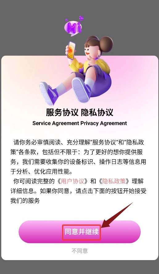 首次打开应用时,需要点击“同意并继续”,确认后才能进入主界面。