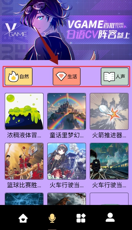 声音界面提供自然、生活、人声等类别的背景音效供用户选择。